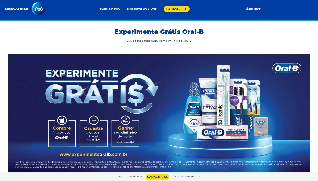 Para participar da promoção e testar produtos da Oral-B gratuitamente, compre pelo menos um produto da marca Oral-B em uma loja participante, são muitas opções em todo o Brasil, veja todos disponíveis no site, link no final do post. Cadastre seu cupom fiscal no site oficial da promoção e receba o seu dinheiro de volta no valor de até R$ 40,00 via PicPay. Se ainda não possui o aplicativo, é só instalar em seu celular e fazer o cadastro.