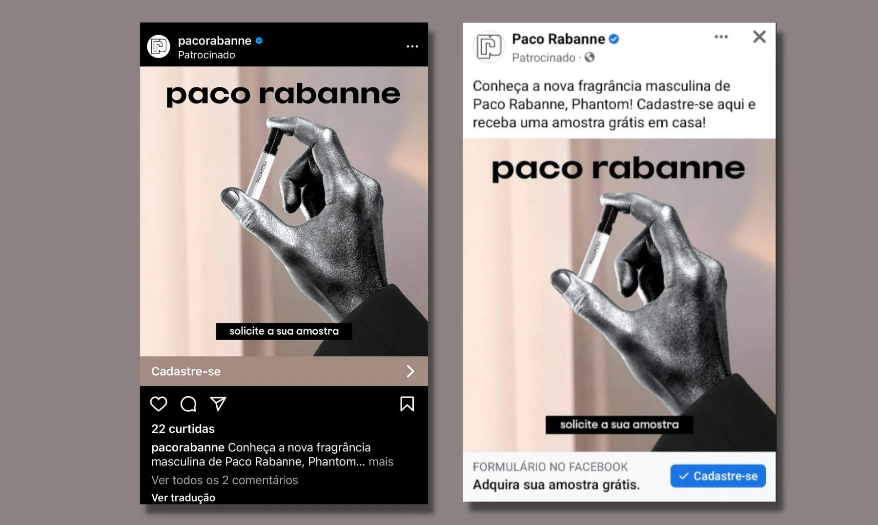 Os anúncios aparecerão no Instagram ou Facebook, como nas kimagens acima, enquanto você visualiza seu feed. Não há links disponíveis, mas há diversas formas de exibir um anúncio, seguir, curtir e comentar o post oficial do perfil da marca Paco Rabanne no Facebook e Instagram. Pesquise sobre o Phantom no Google para que os mecanismos de anúncio saibam que você está interessado na fragrância dessa marca.